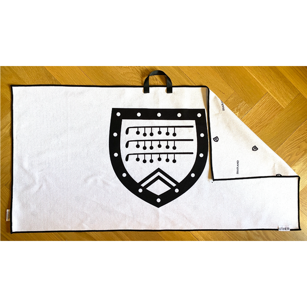 Clean your clubs like the pros with this white, microfiber towel with black trim by UTHER Supply. Dual-sided sublimation print with a large Shapland logo on one side and dancing logo/text on the other.